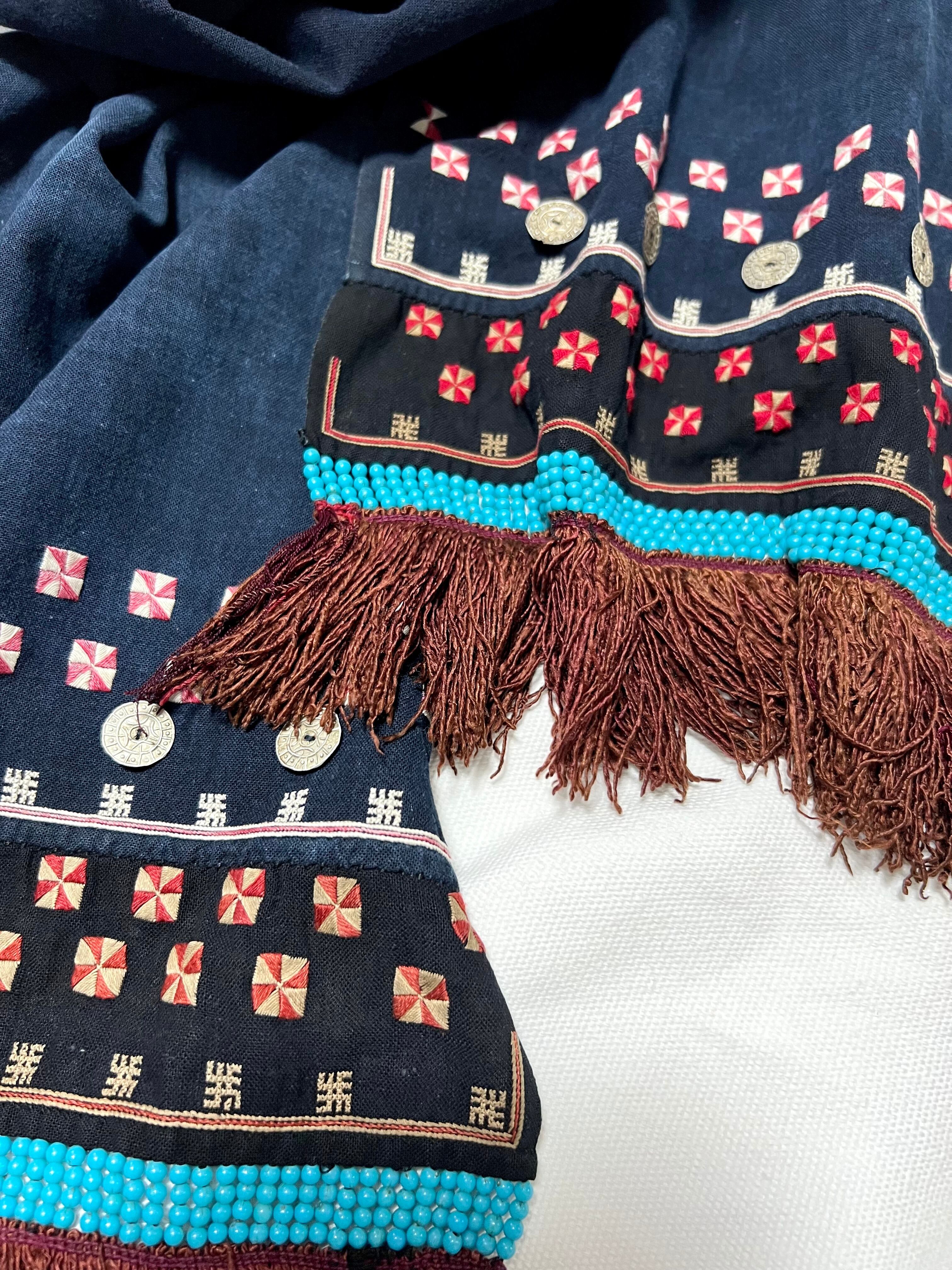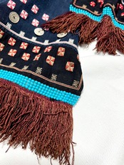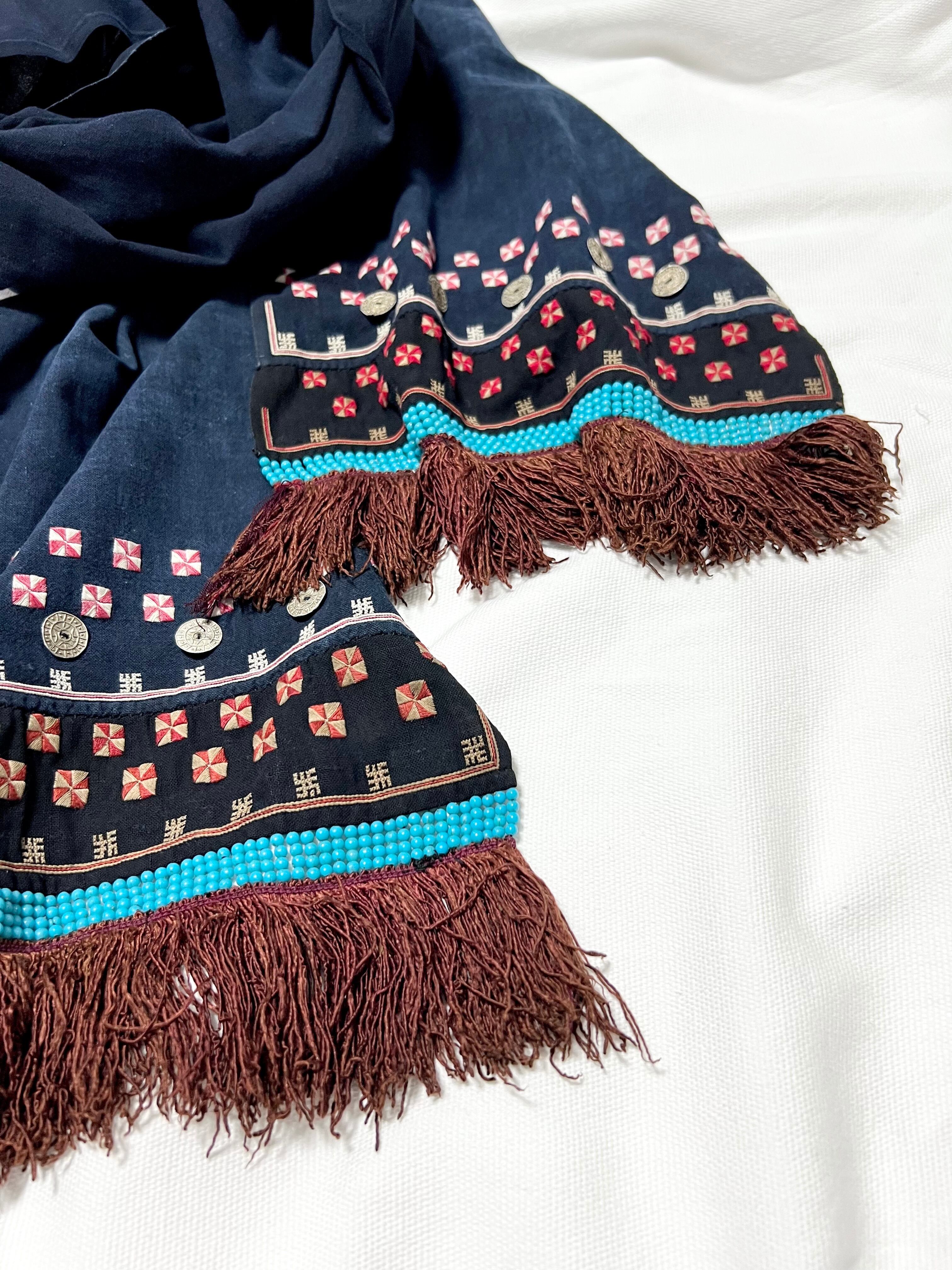 ベッドドレスは、藍で染められた布に、二重の卍模様や鳥などのモチーフを模した柄など緻密な刺繍が施されていて、更に裾部分には、ビーズと赤い絹の房飾りが付けられています。(こちらの商品は、珍しいブラウンの絹糸が使われています。)