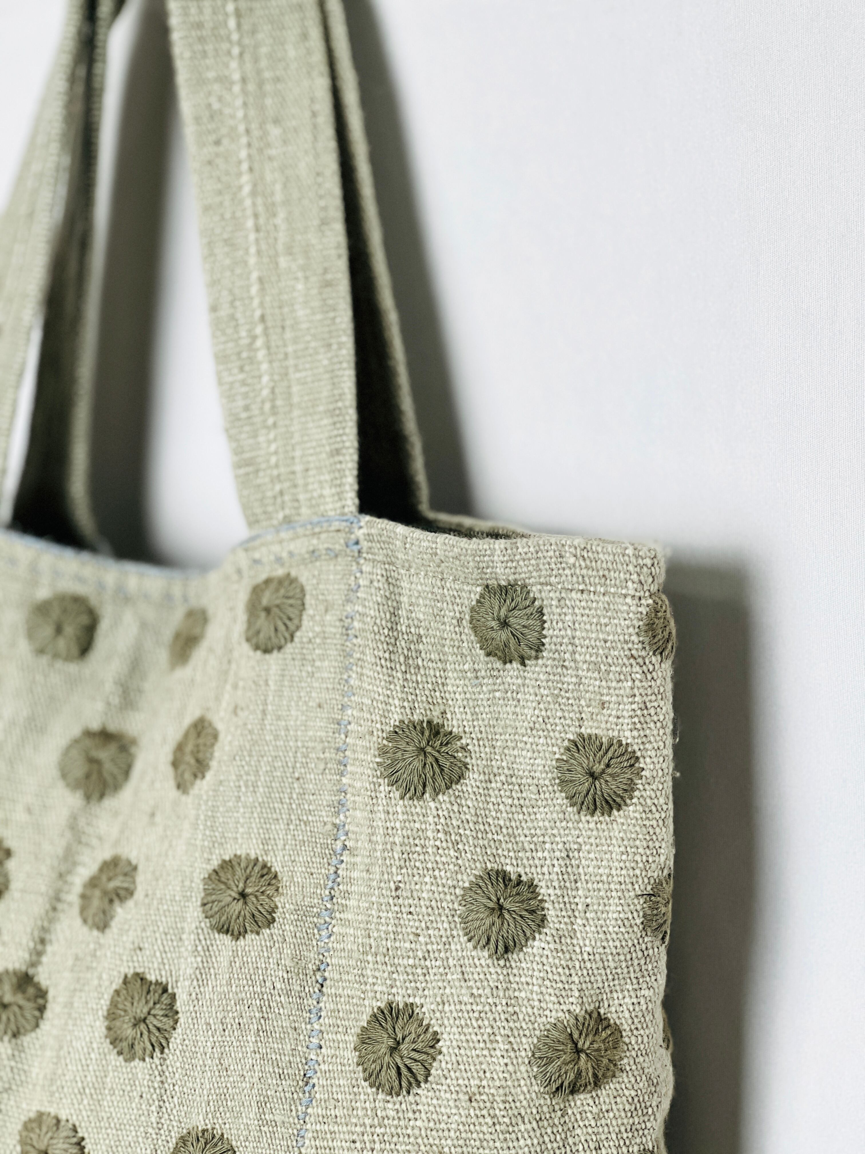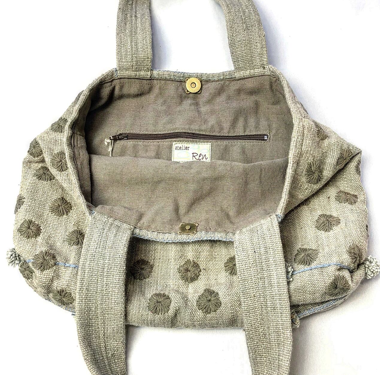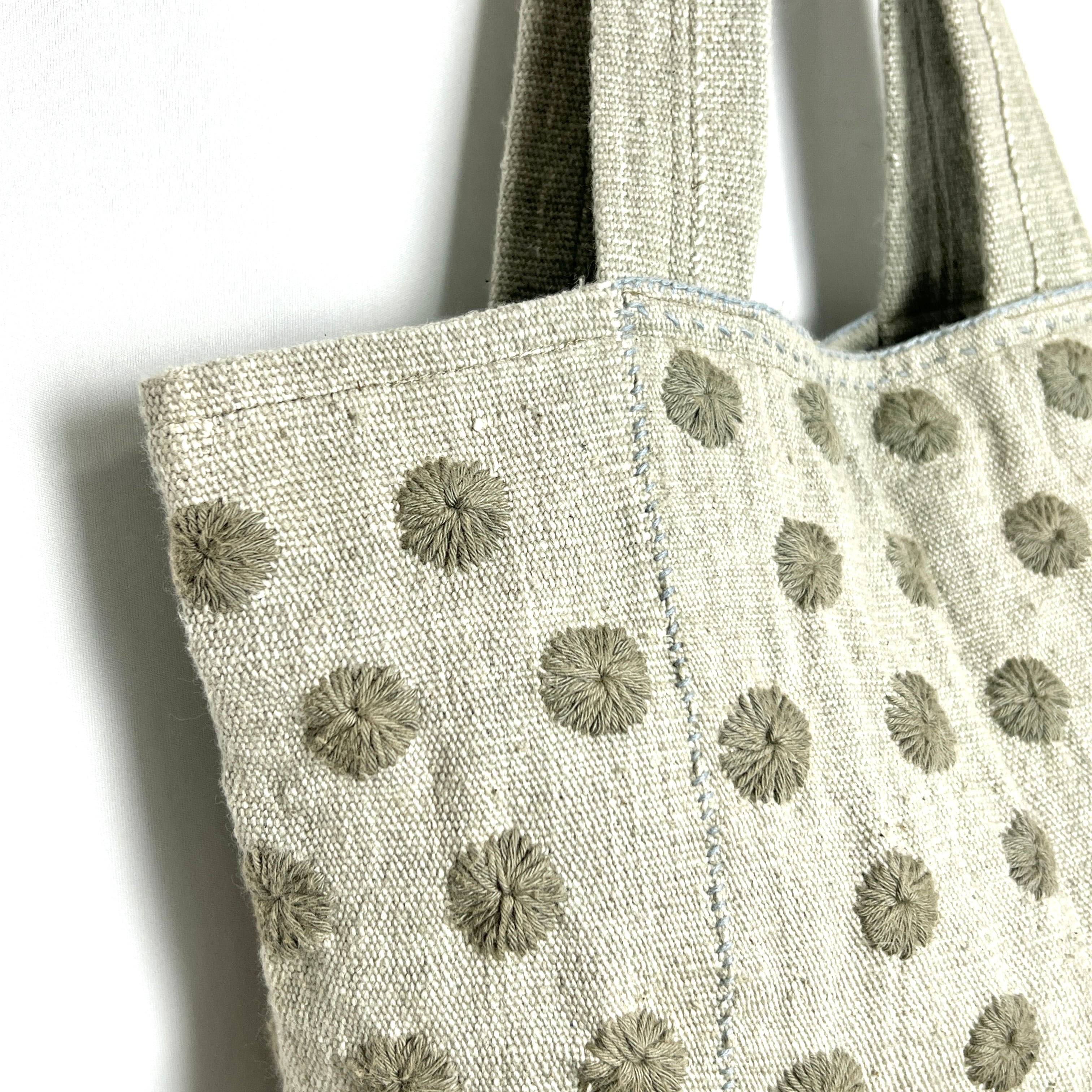 そして更に、アトリエレンで一手間加えます。一針一針丁寧に両面びっしりの花刺繍を加え、手仕事の魅力を十分に楽しんで頂けるバッグへと仕上げています。