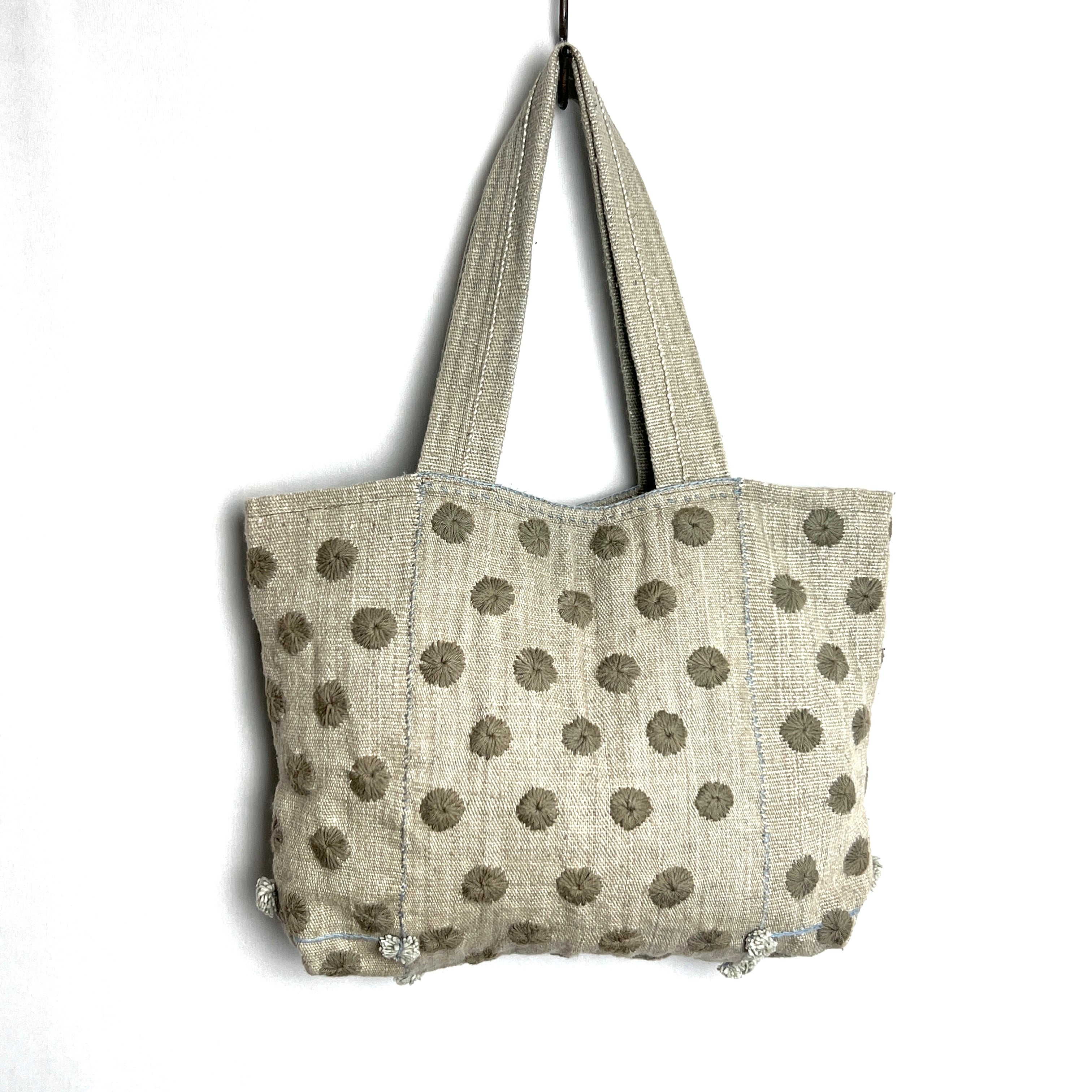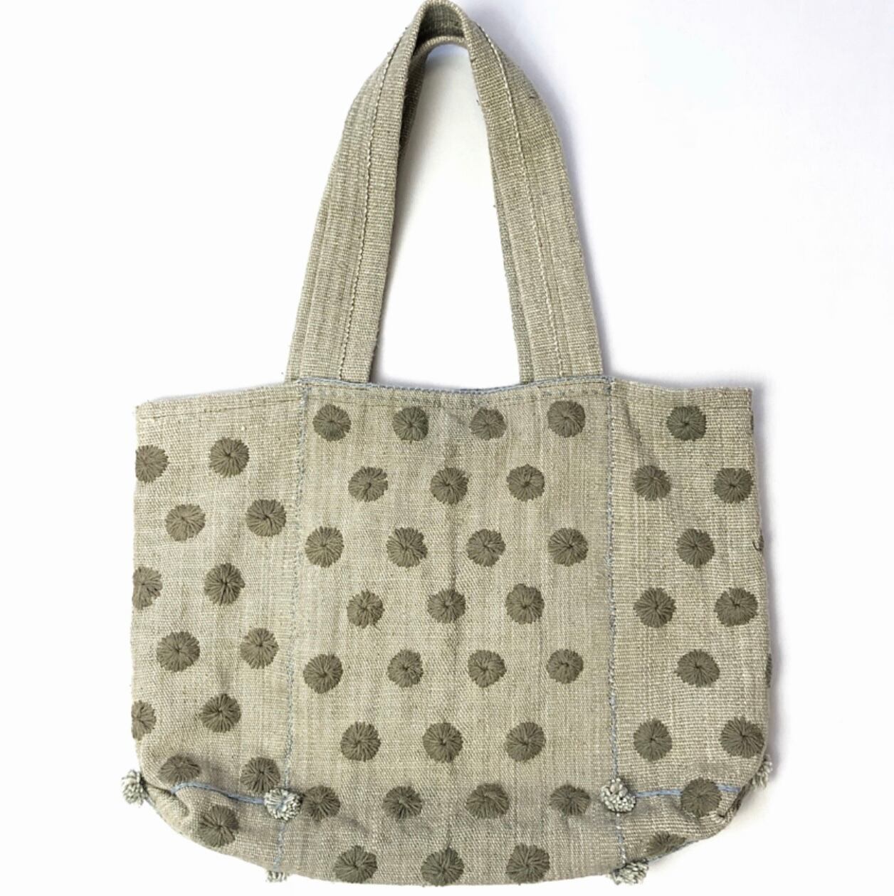 両面びっしりの花刺繍。バッグ本体と同系色の糸を使っています。ぽこぽことした表情がたまりません♡ バッグの底部分にポンポンも。