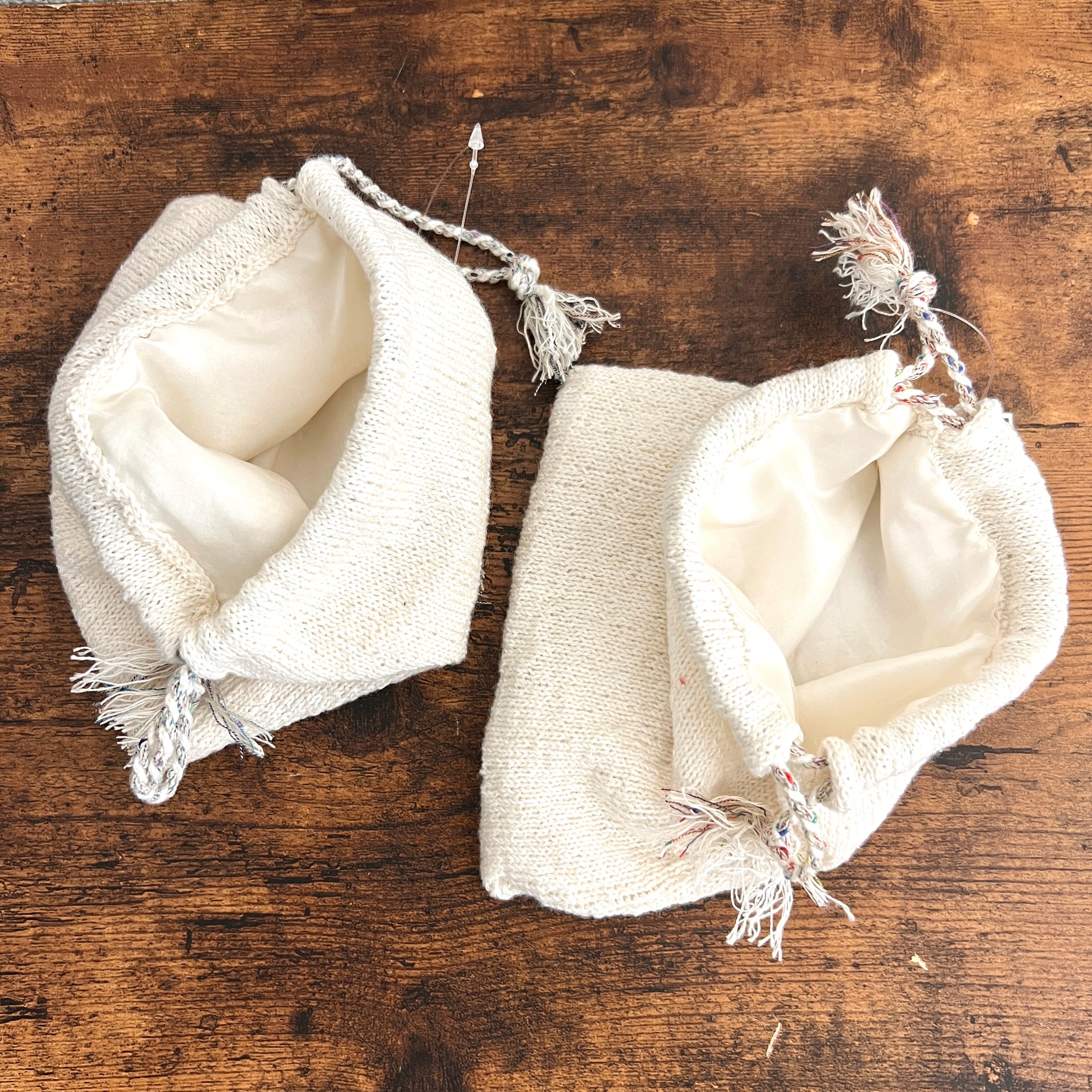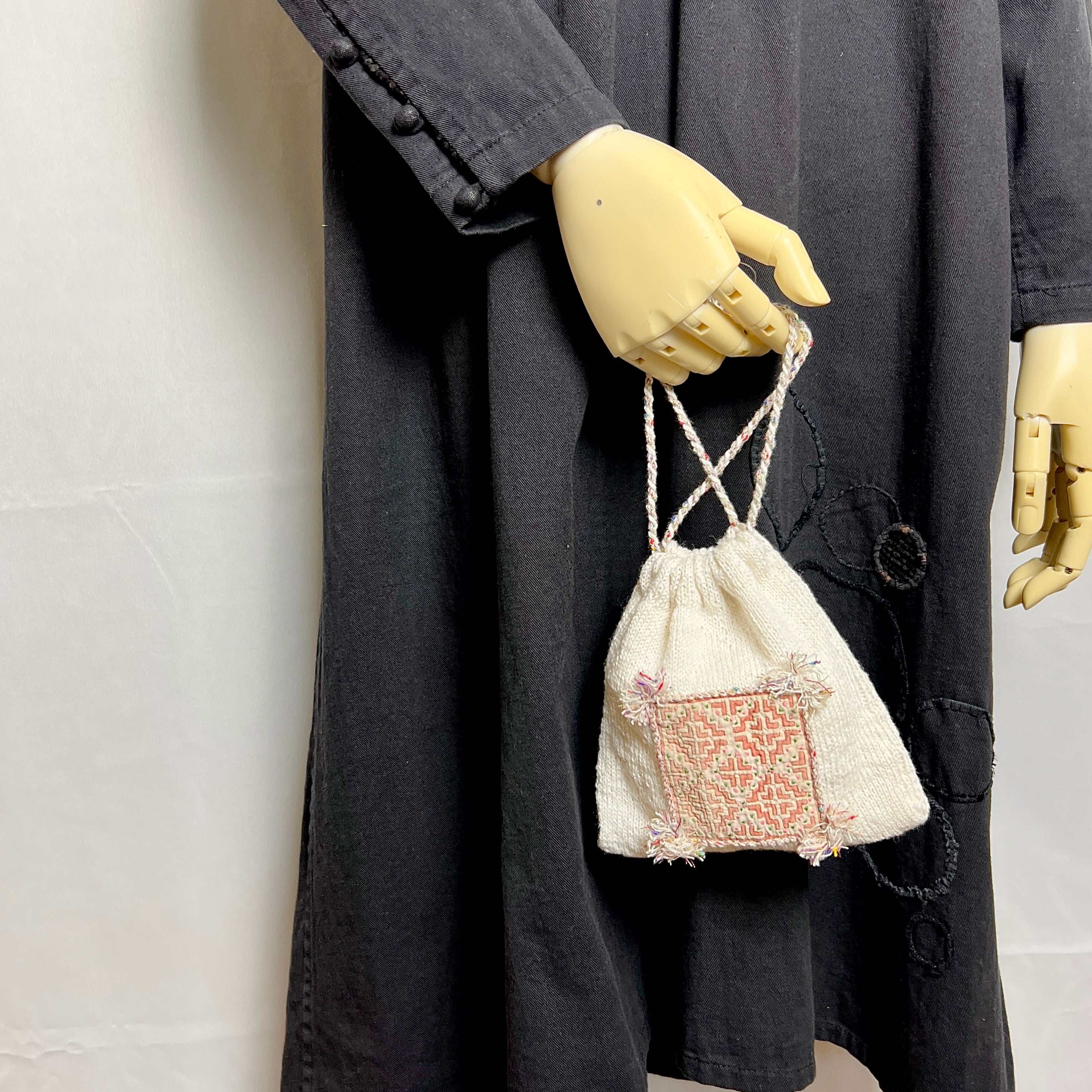 この小さな巾着袋の本体はニット。オフホワイトの混紡糸で手編みしたものです。