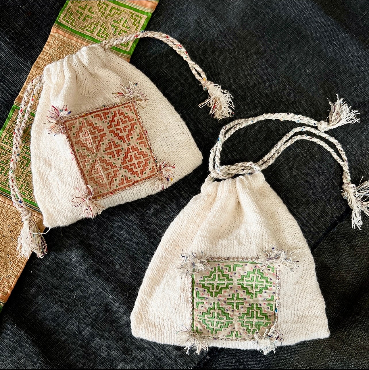 ホワイトモン族の民族衣装で、腰巻部分の装飾に使うアップリケ(刺繍布)を解体して作った巾着袋です。