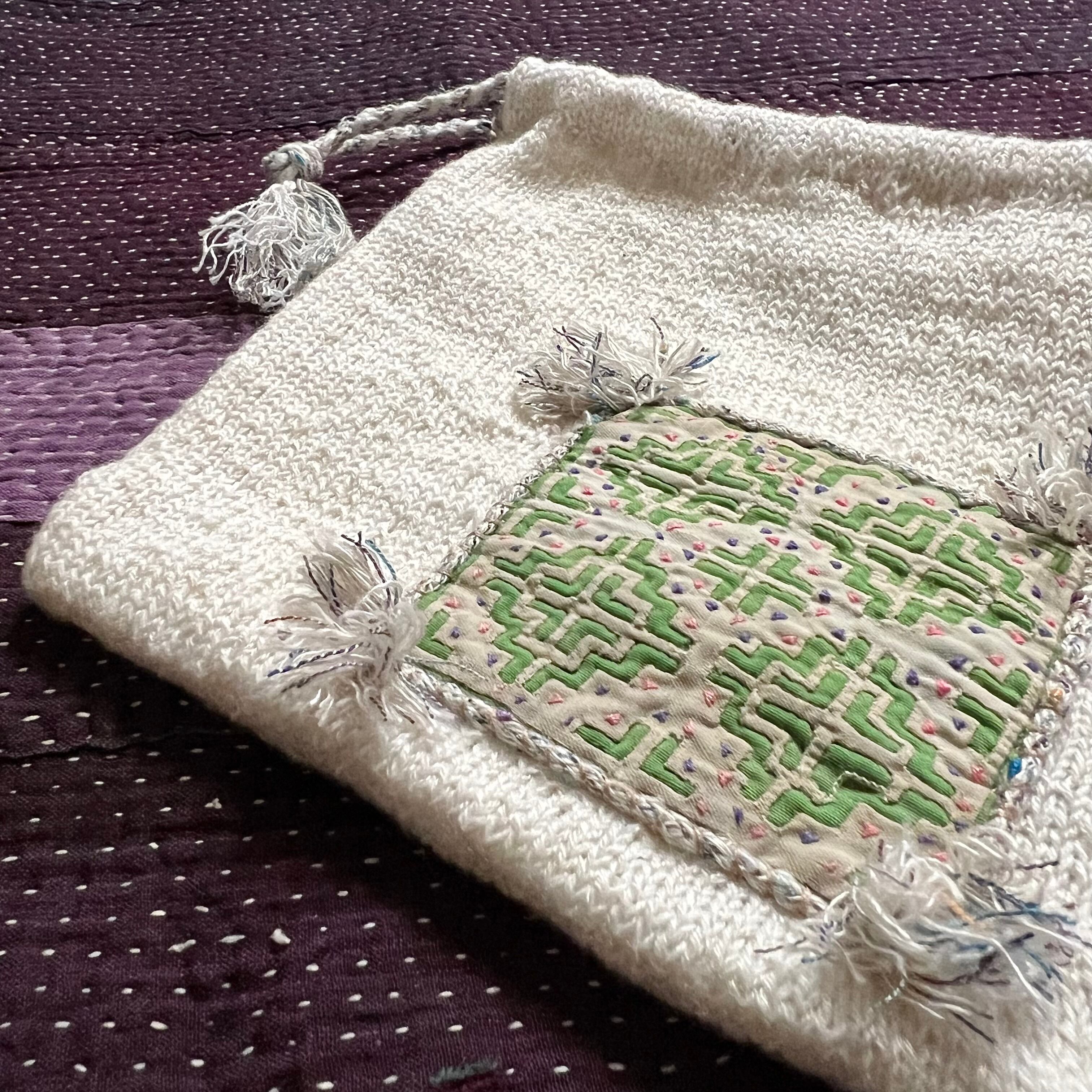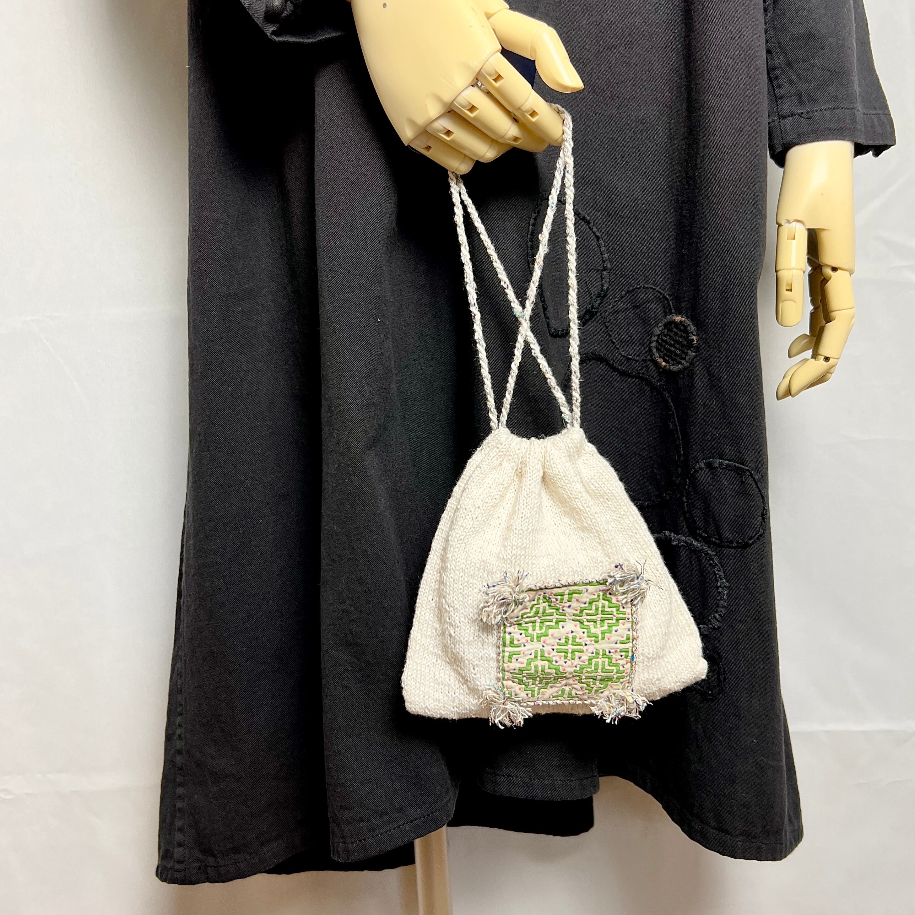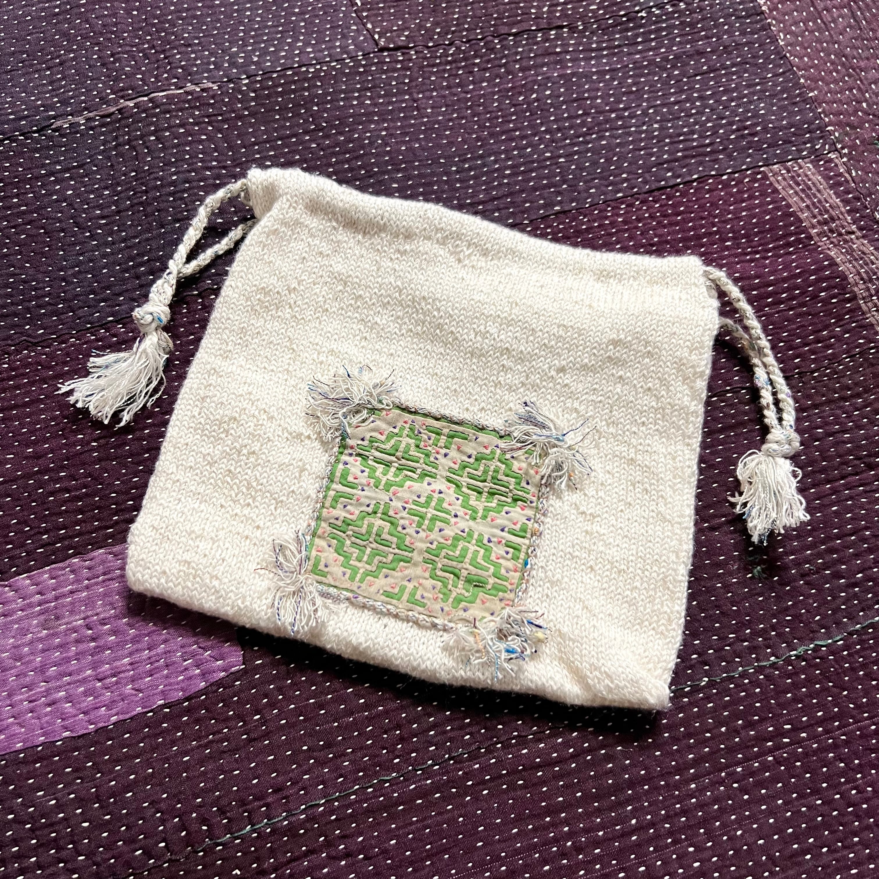 この小さな巾着袋の本体はニット。オフホワイトの混紡糸で手編みしたものです。