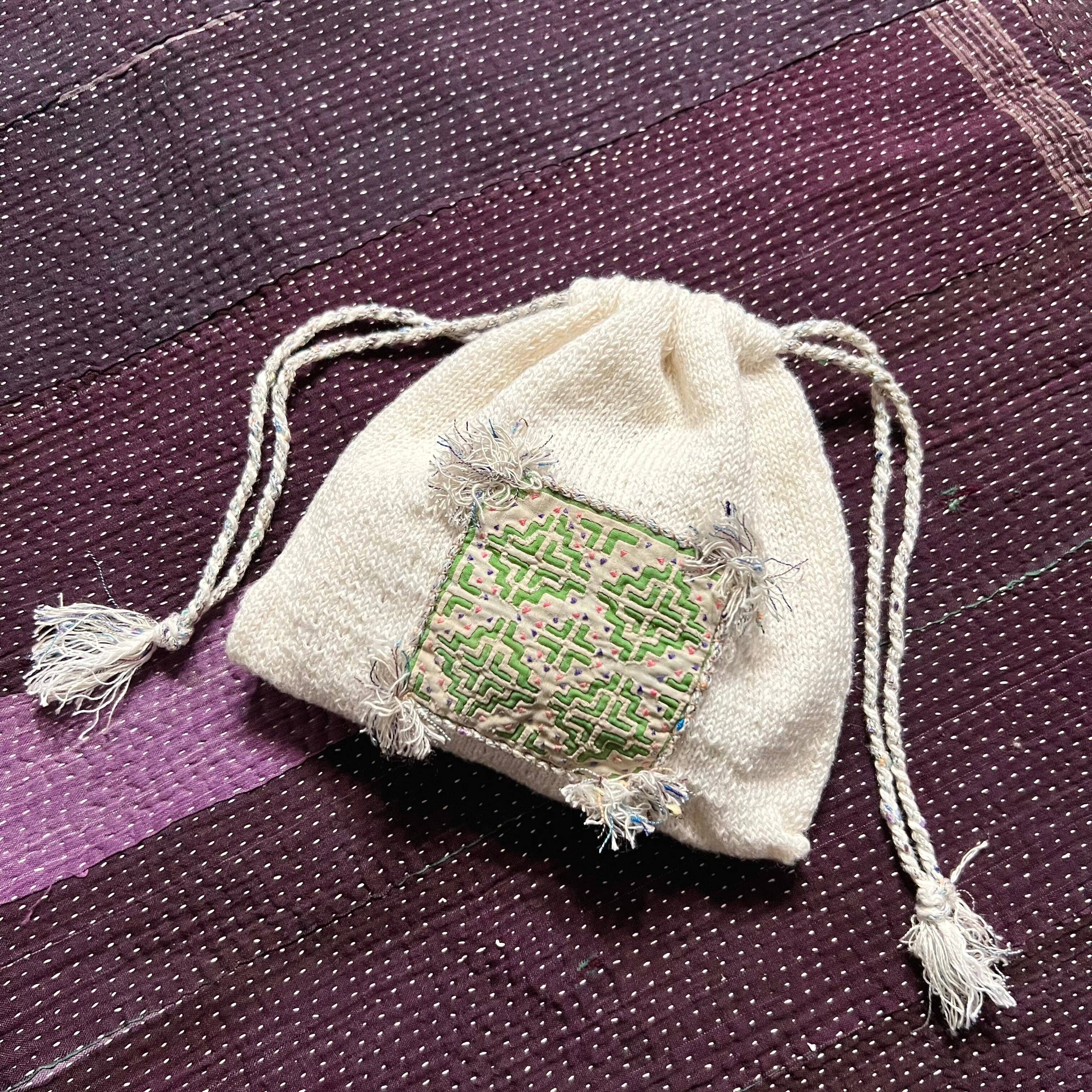 ホワイトモン族の民族衣装で、腰巻部分の装飾に使うアップリケ(刺繍布)を解体して作った巾着袋です。