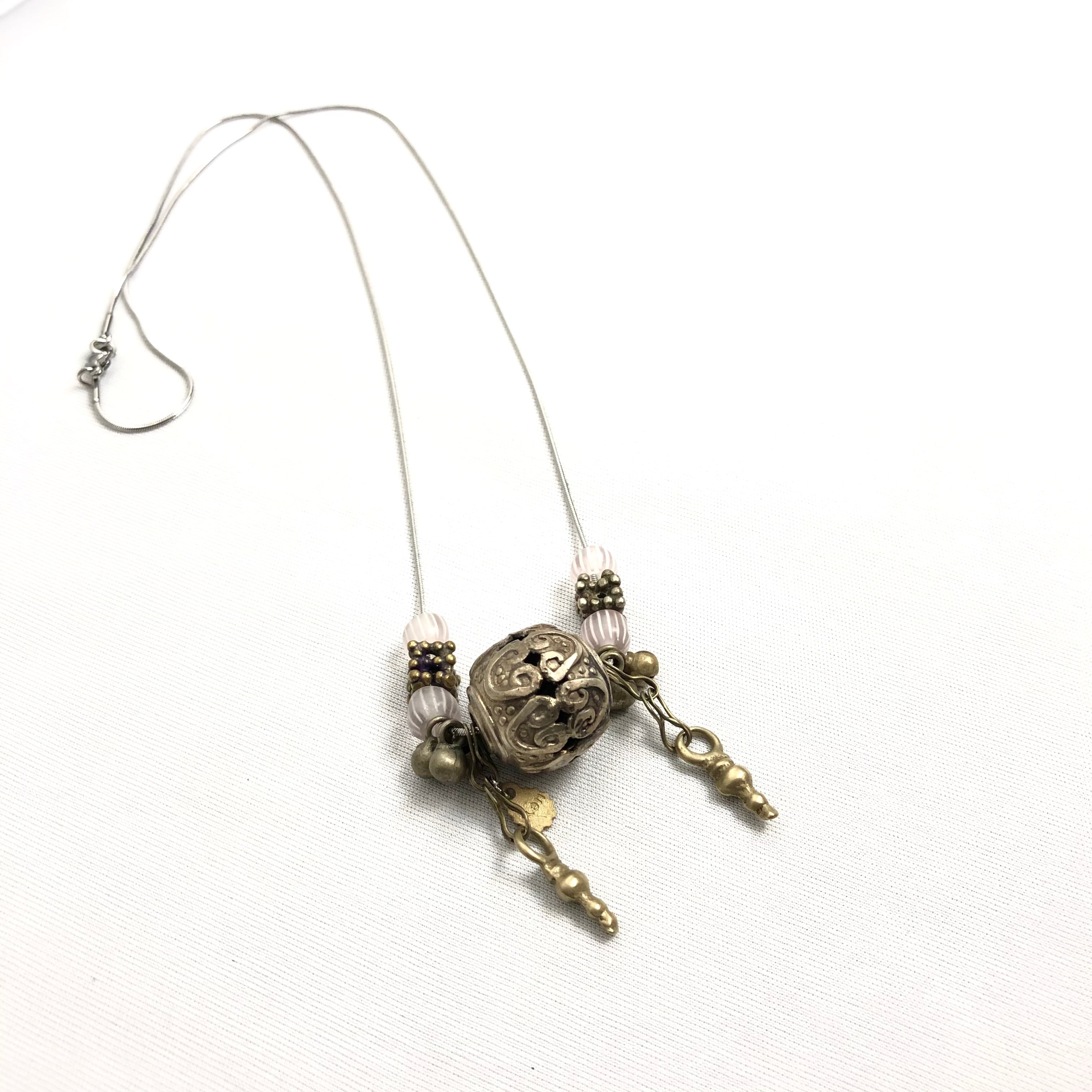 ヴェネチア産トレードグラスビーズで、グーズベリーと呼び名を持つ、ピンクカラーのビーズも使っています。こちらは比較的新しいものです。