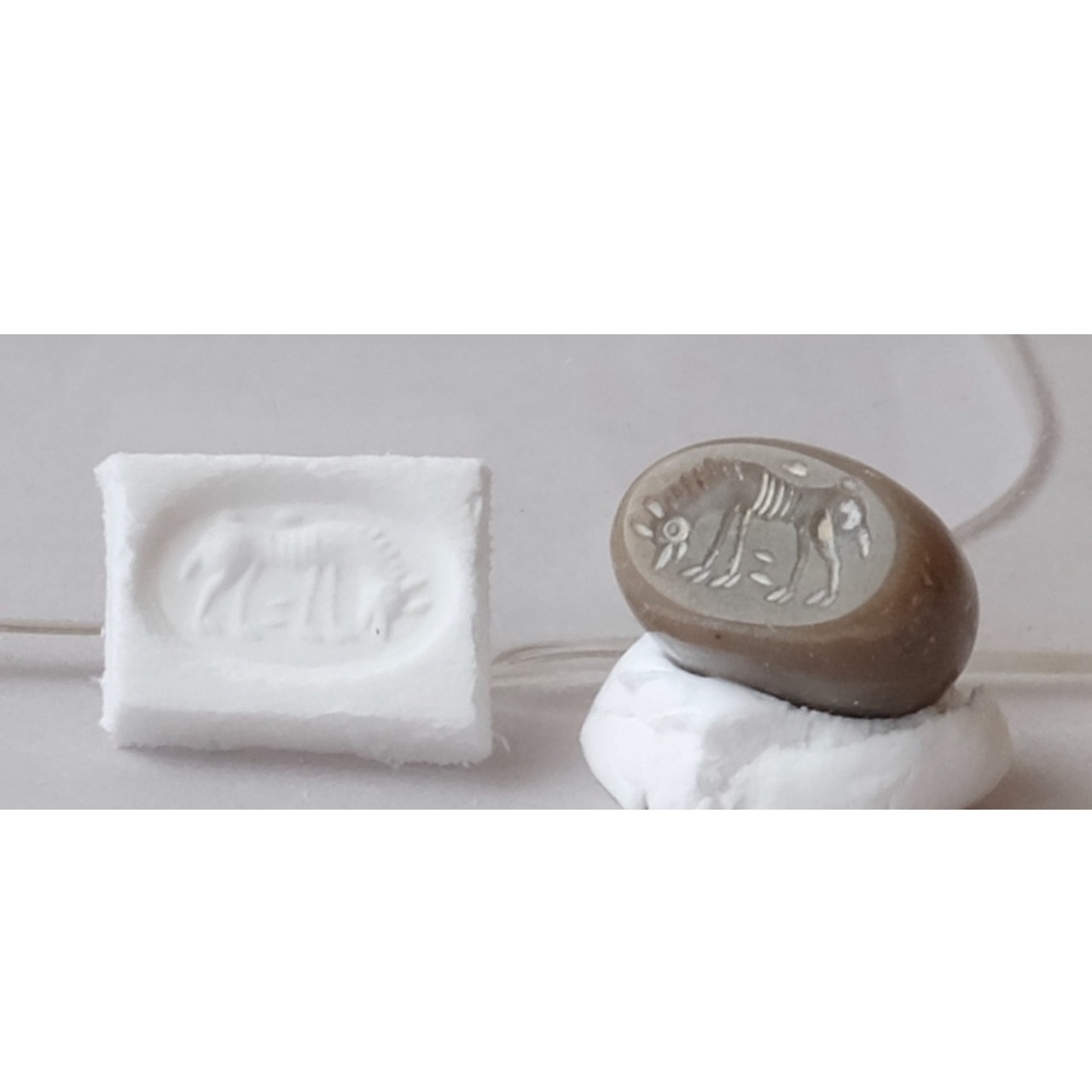 古代メソポタミアなどで使われた、ササン朝ペルシャのドーム型の印章(シリンダーシール)を、装身具用に穴あけ加工が施された、不透明な碧玉(へきぎょく/ジャスパー)のビーズ。