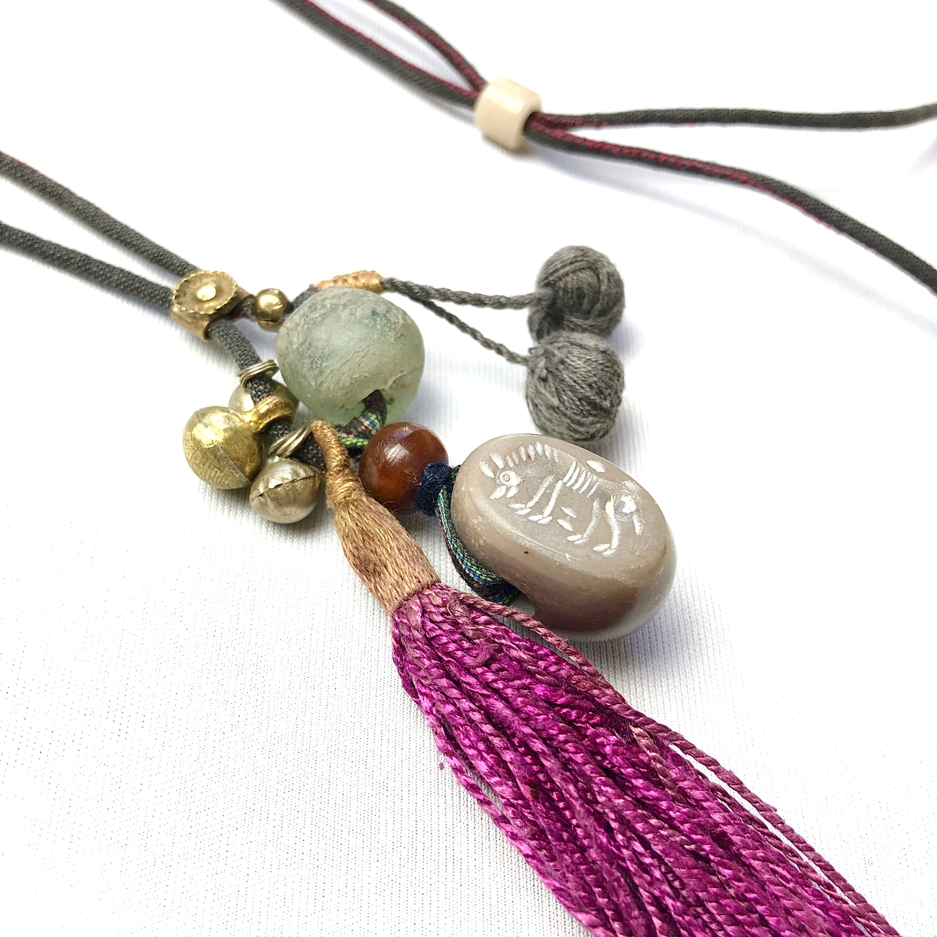 動物が刻まれたストーンビーズをメインに、メタルビーズやビンテージビーズ、ヤオ族やミャオ族の素材等を組み合わせた、個性溢れる唯一無二のネックレスを作りました。