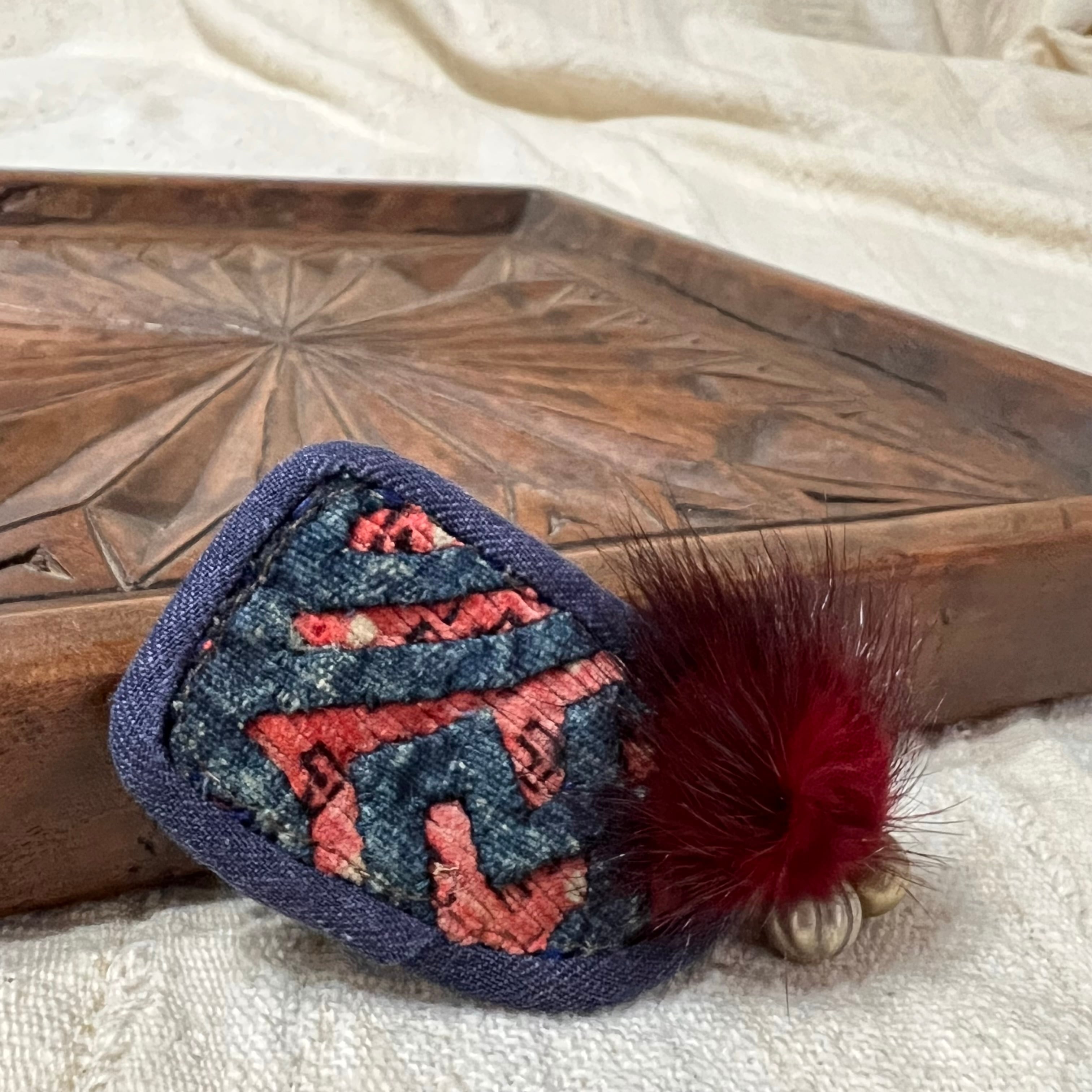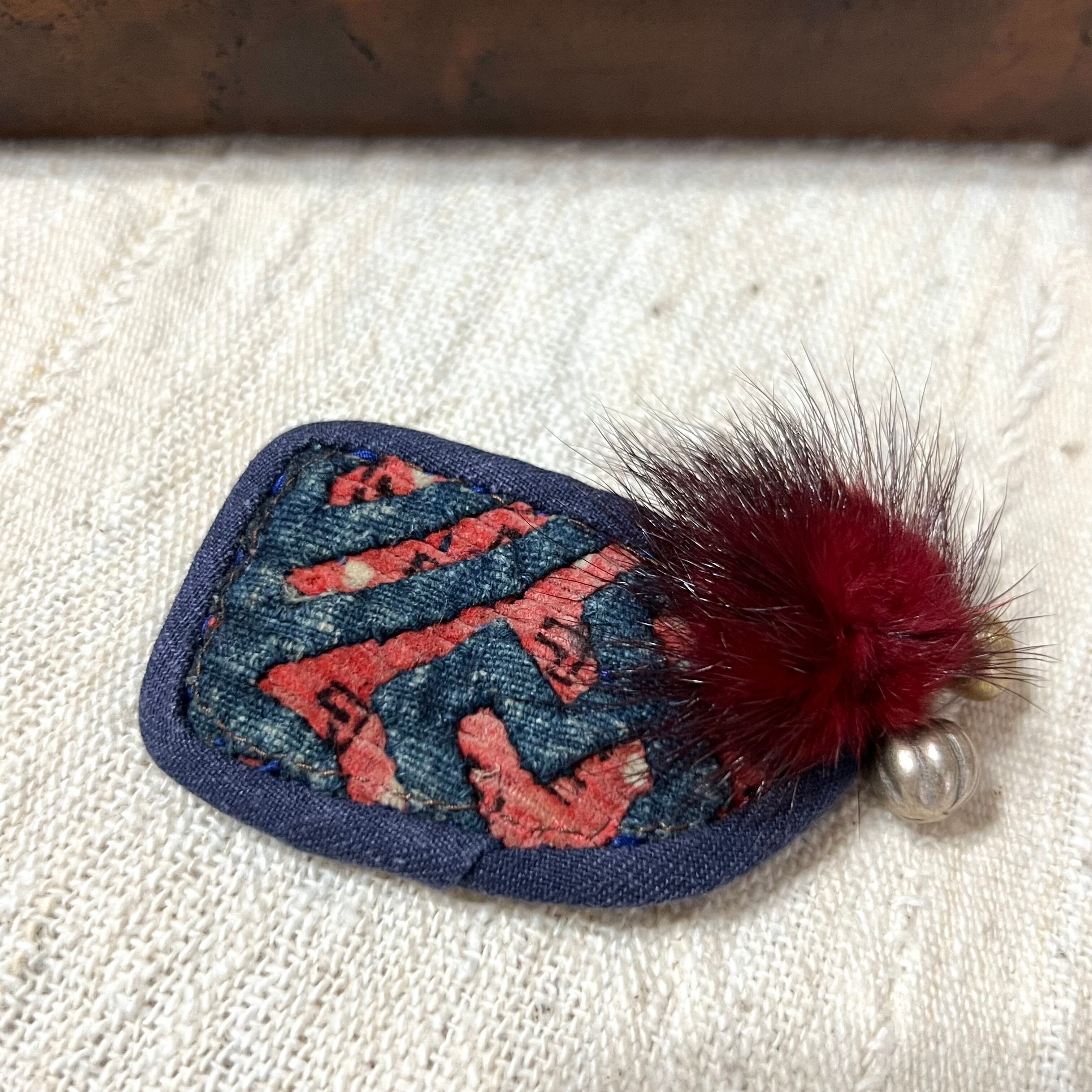 その小さなハギレから作る、赤とインディゴトーンのブローチトップに、ワインカラーのリアルファーとカレンシルバーボール、アトリエレンオリジナル真鍮ボールが装飾されています。