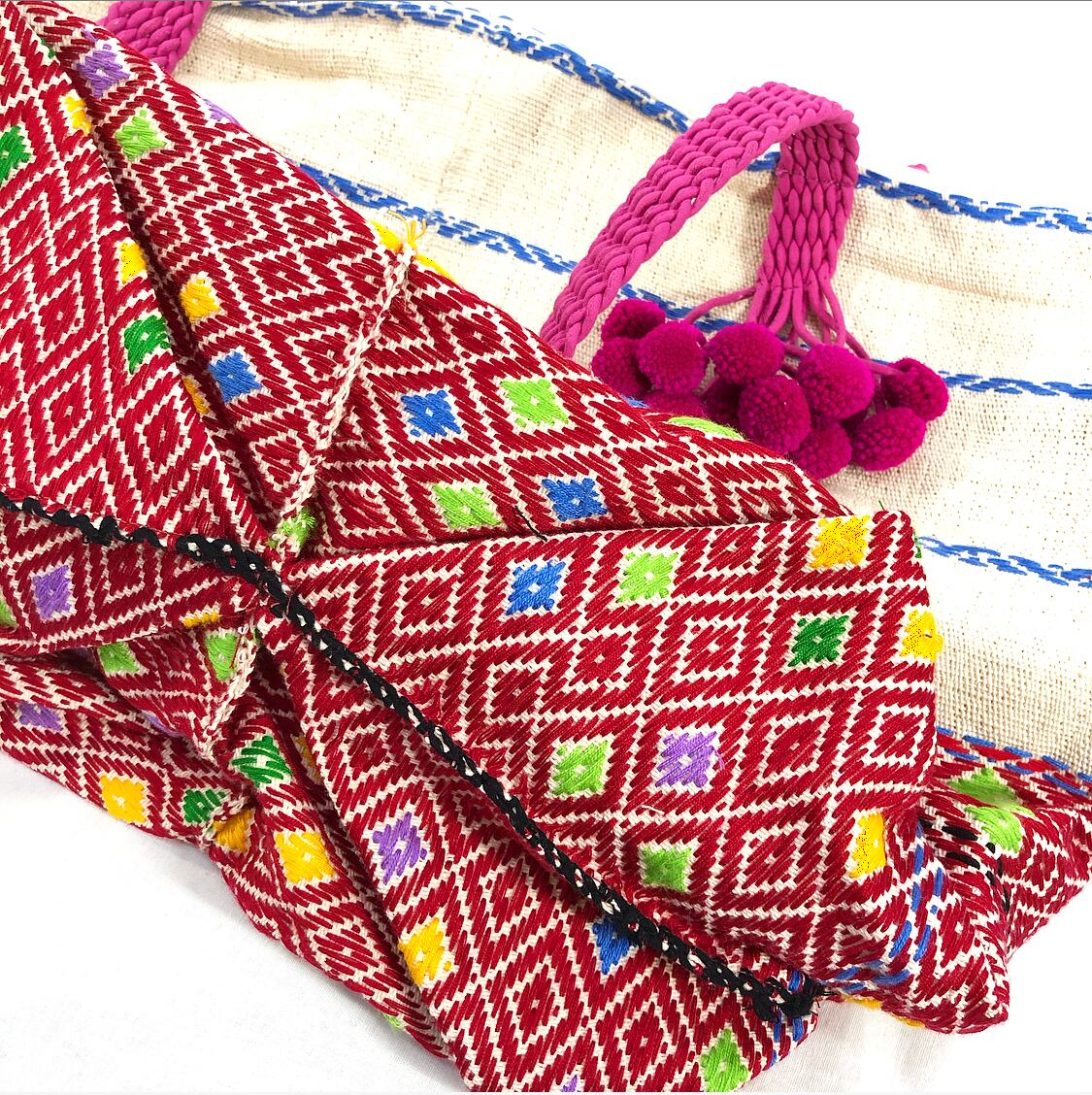 生成(ナチュラル)地に、カラフルな幾何学模様が夏らしいイメージで、ざっくりとした手織りコットンの風合いをお楽しみ頂けます。