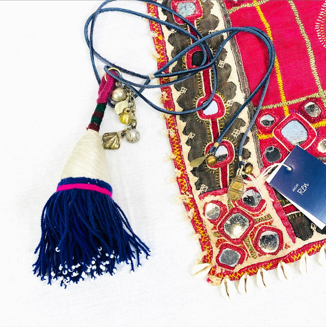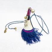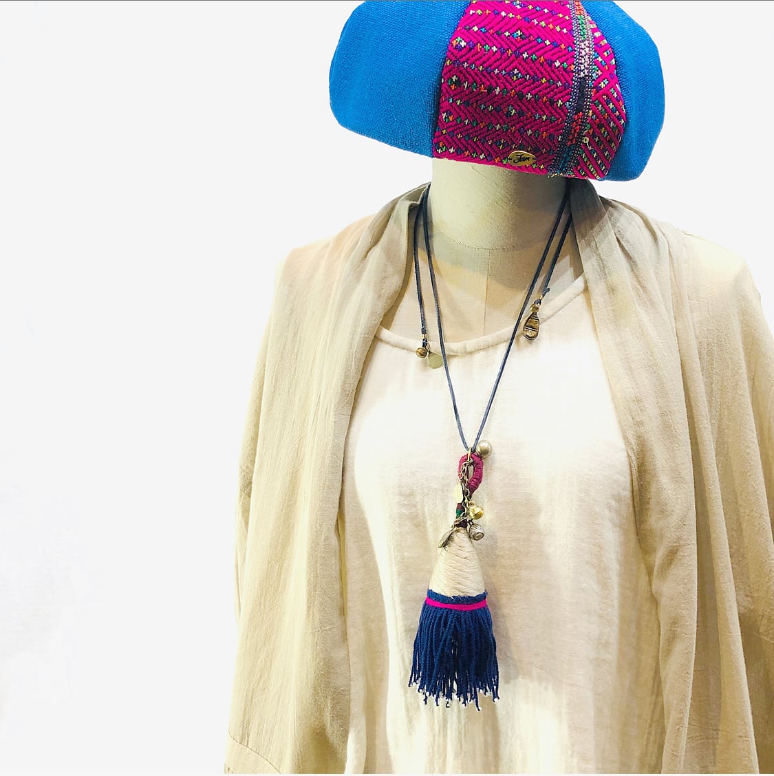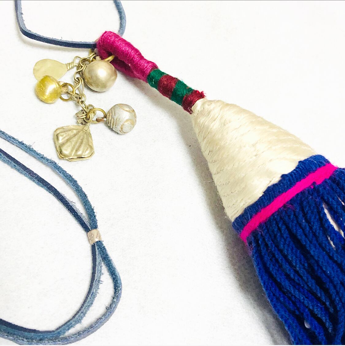 タッセルを胸元位置くらいの長さに設定して、レザーコードを肩から胸元に持ってくると、コードの先端に付いているメタルパーツがアクセントになって、とてもオシャレなネックレスになります。