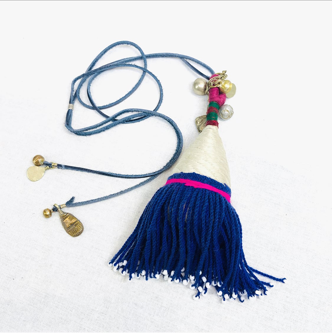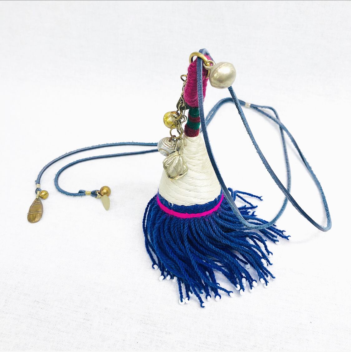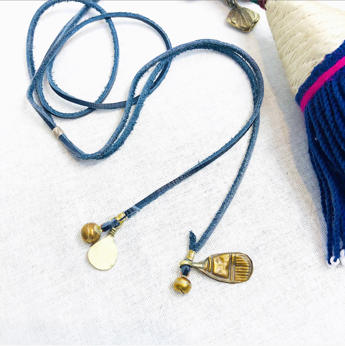 タッセルを胸元位置くらいの長さに設定して、レザーコードを肩から胸元に持ってくると、コードの先端に付いているメタルパーツがアクセントになって、とてもオシャレなネックレスになります。