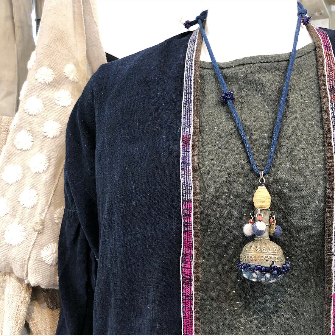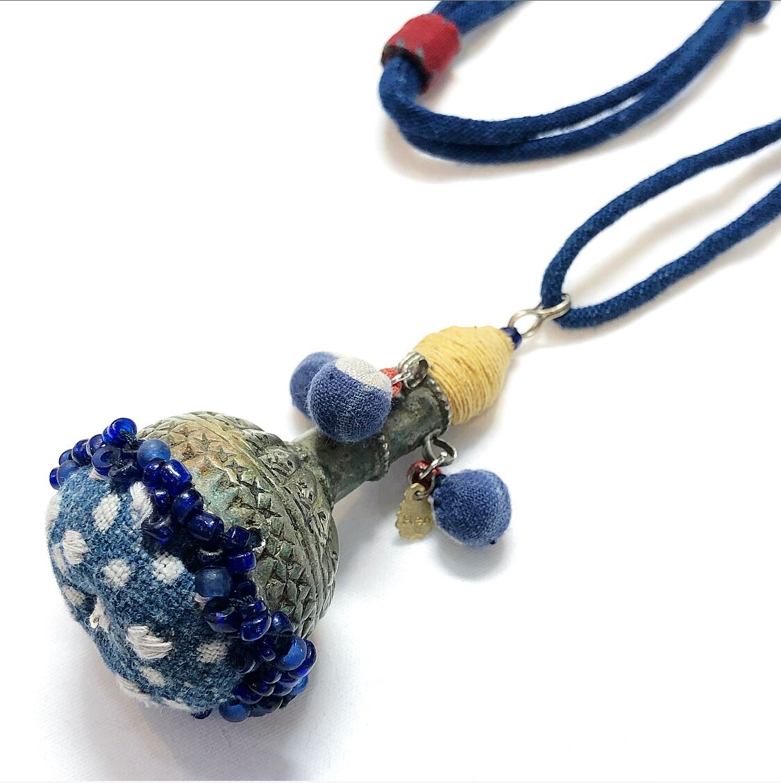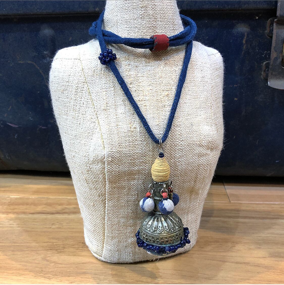 ◯インド・バンジャラ族の手仕事、ラッパのようなメタルの装飾品と、中国ミャオ族の手仕事、藍ろうけつ染めの布で作ったボールを組み合わせたトップが主役のネックレスです。