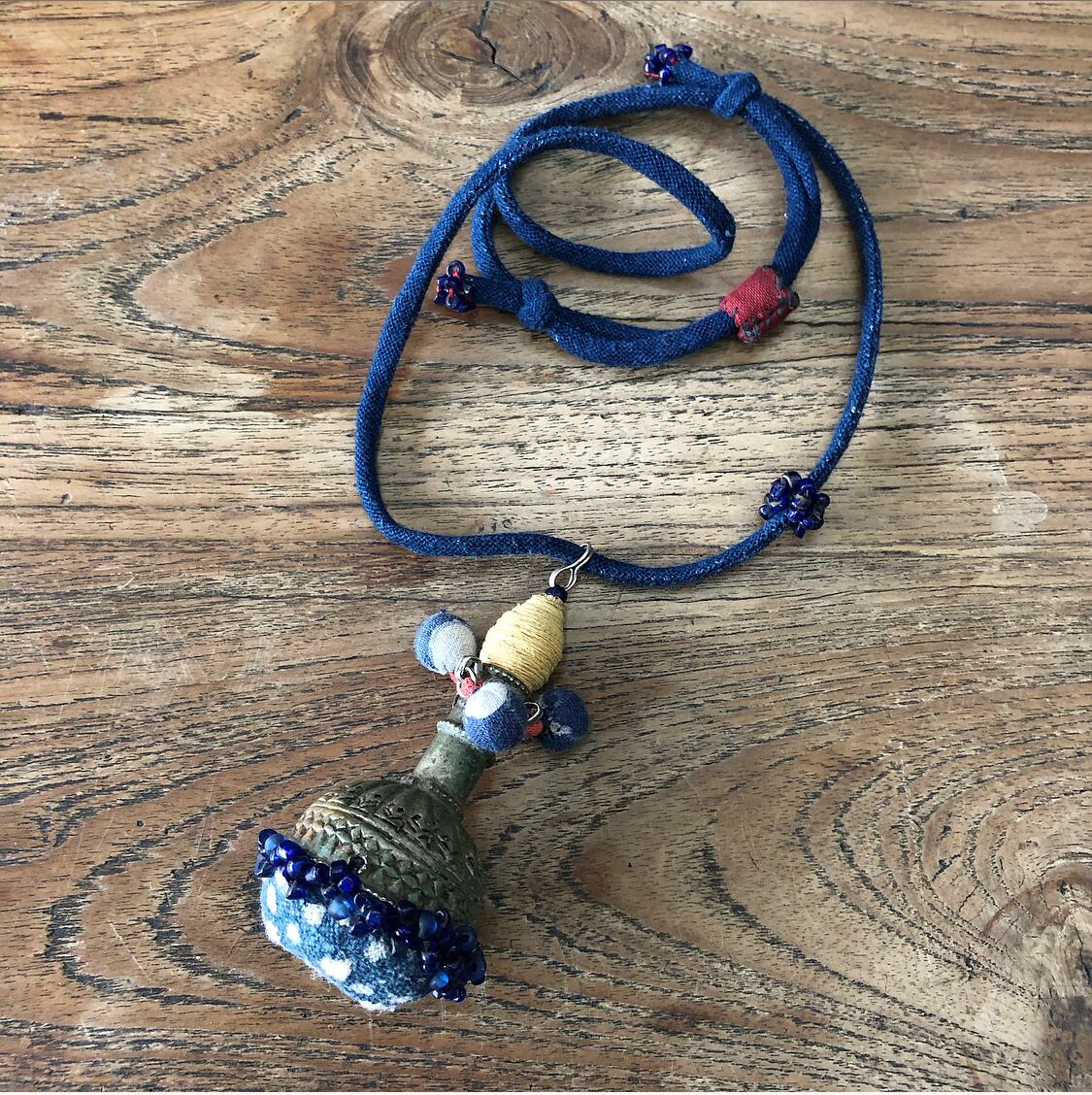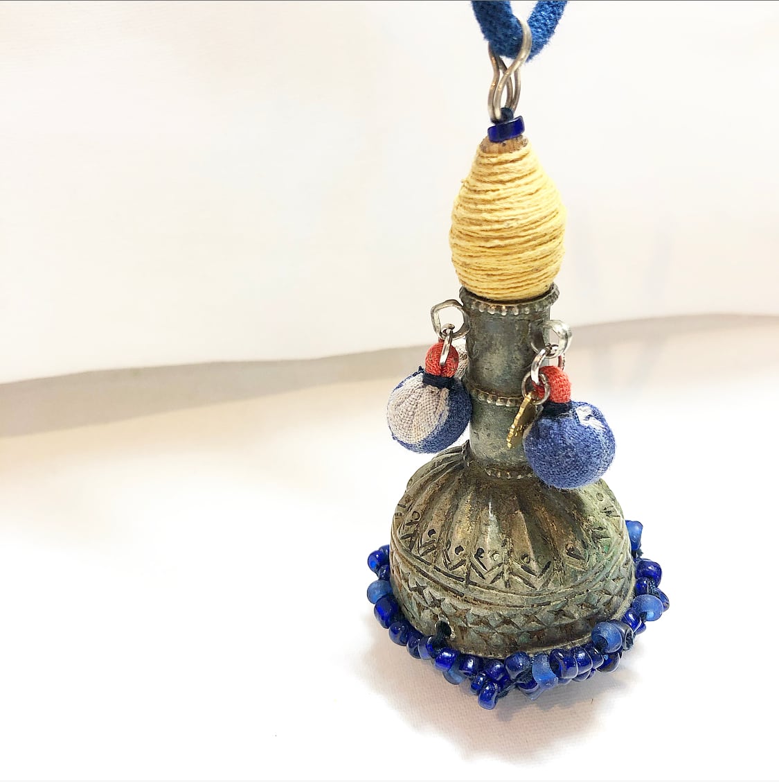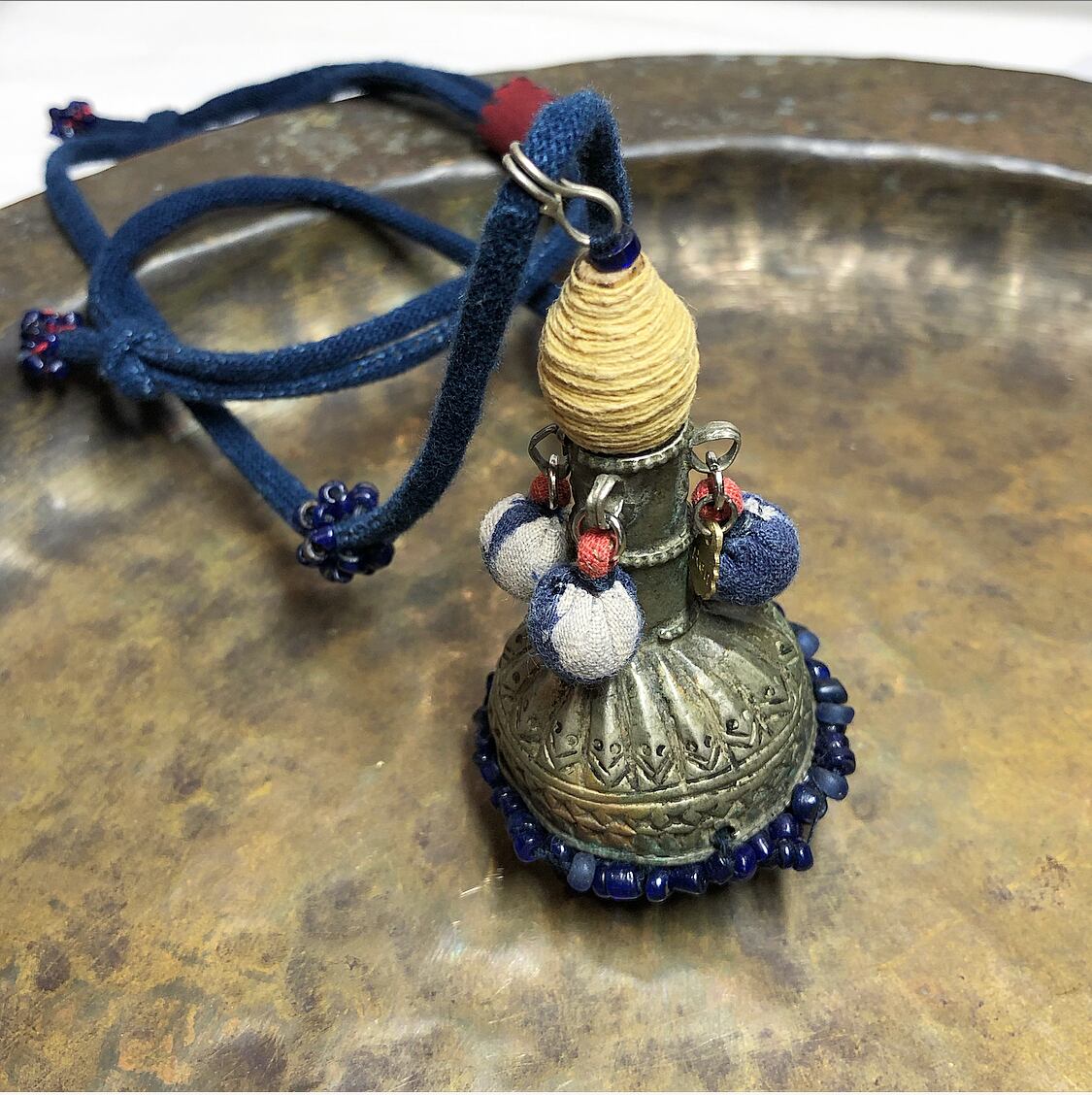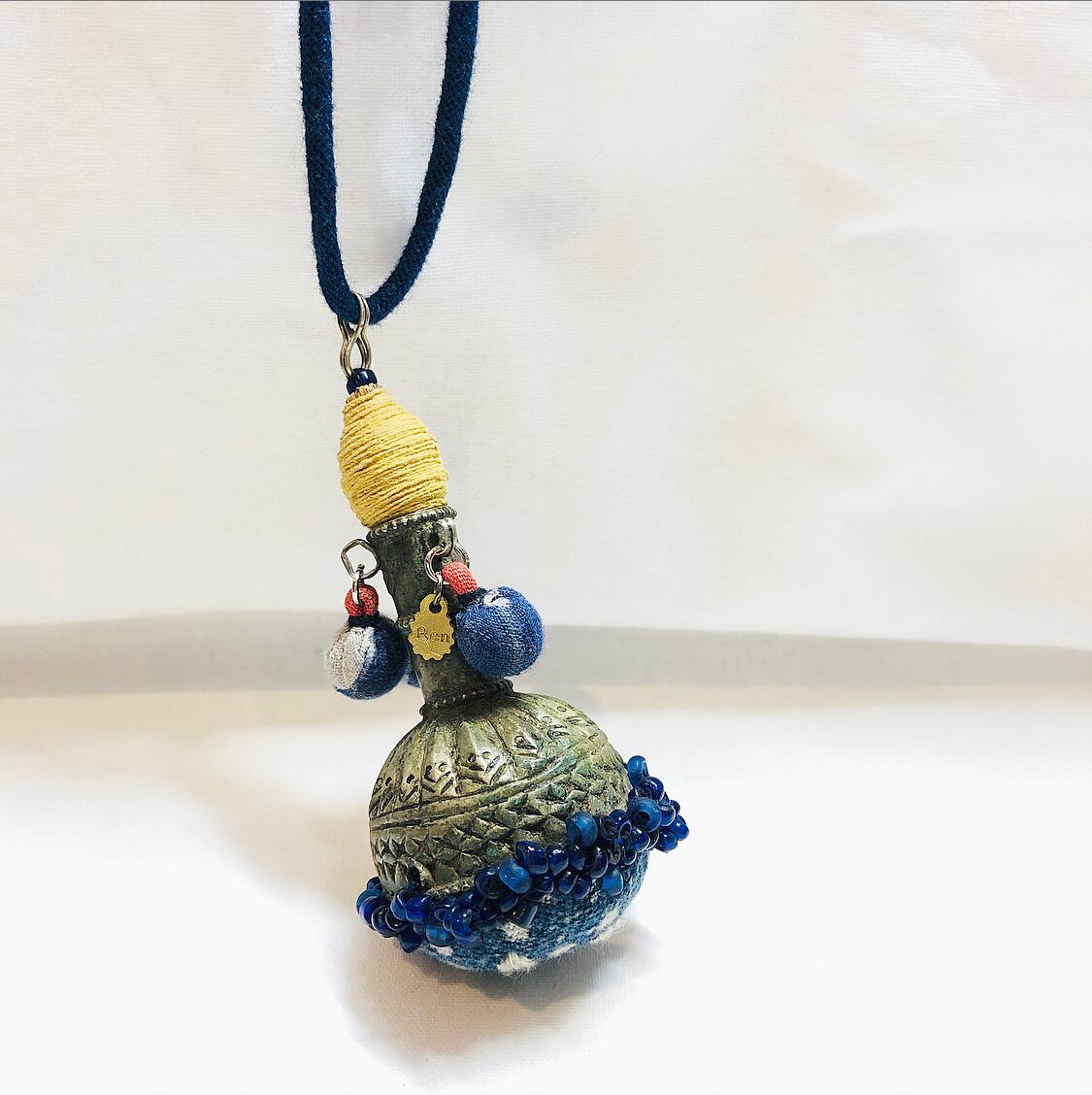 ◯インド・バンジャラ族の手仕事、ラッパのようなメタルの装飾品と、中国ミャオ族の手仕事、藍ろうけつ染めの布で作ったボールを組み合わせたトップが主役のネックレスです。