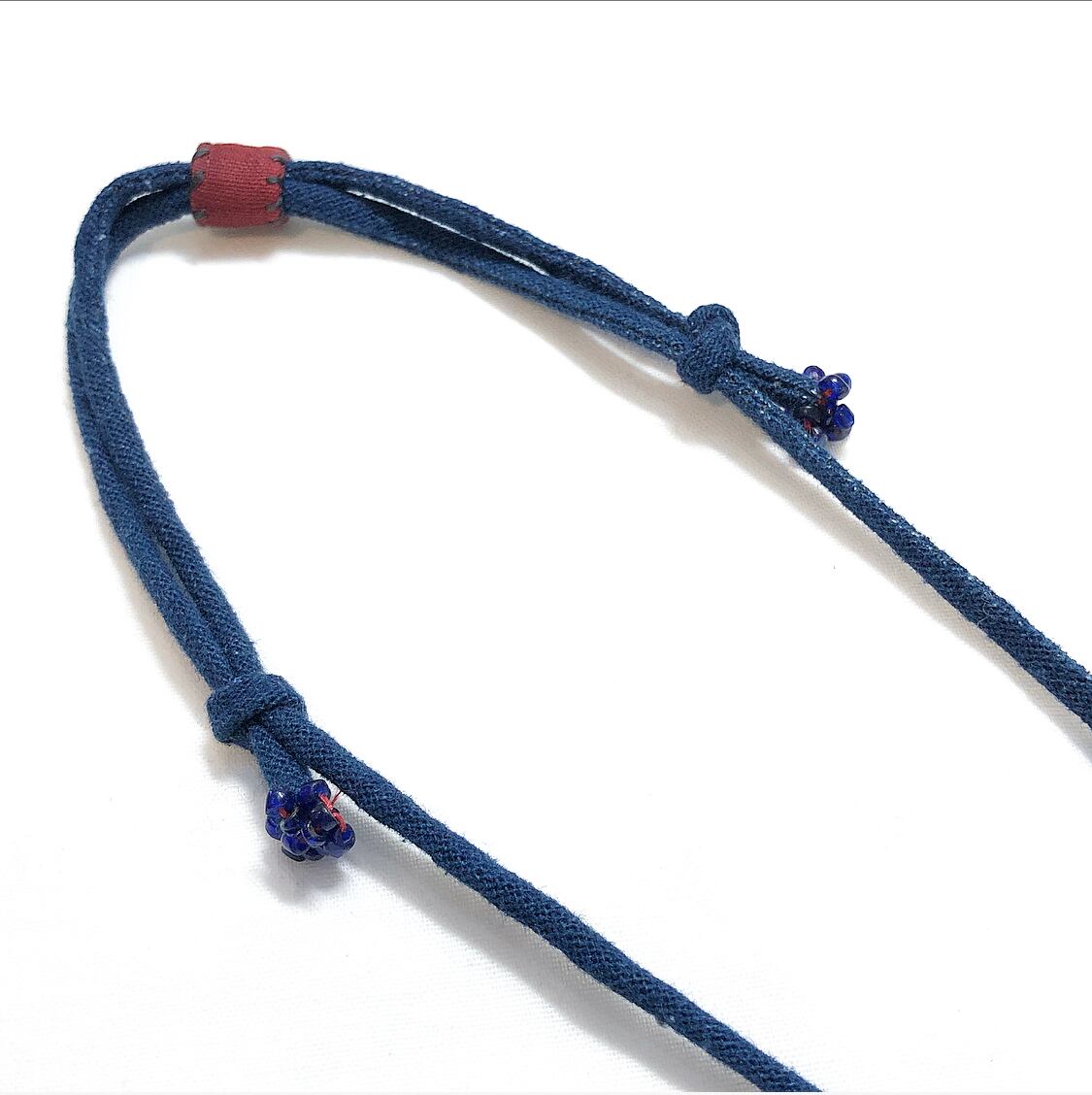 コードは、藍染の布で作った太めサイズ 長さ調節が可能で最大80㎝までOK
