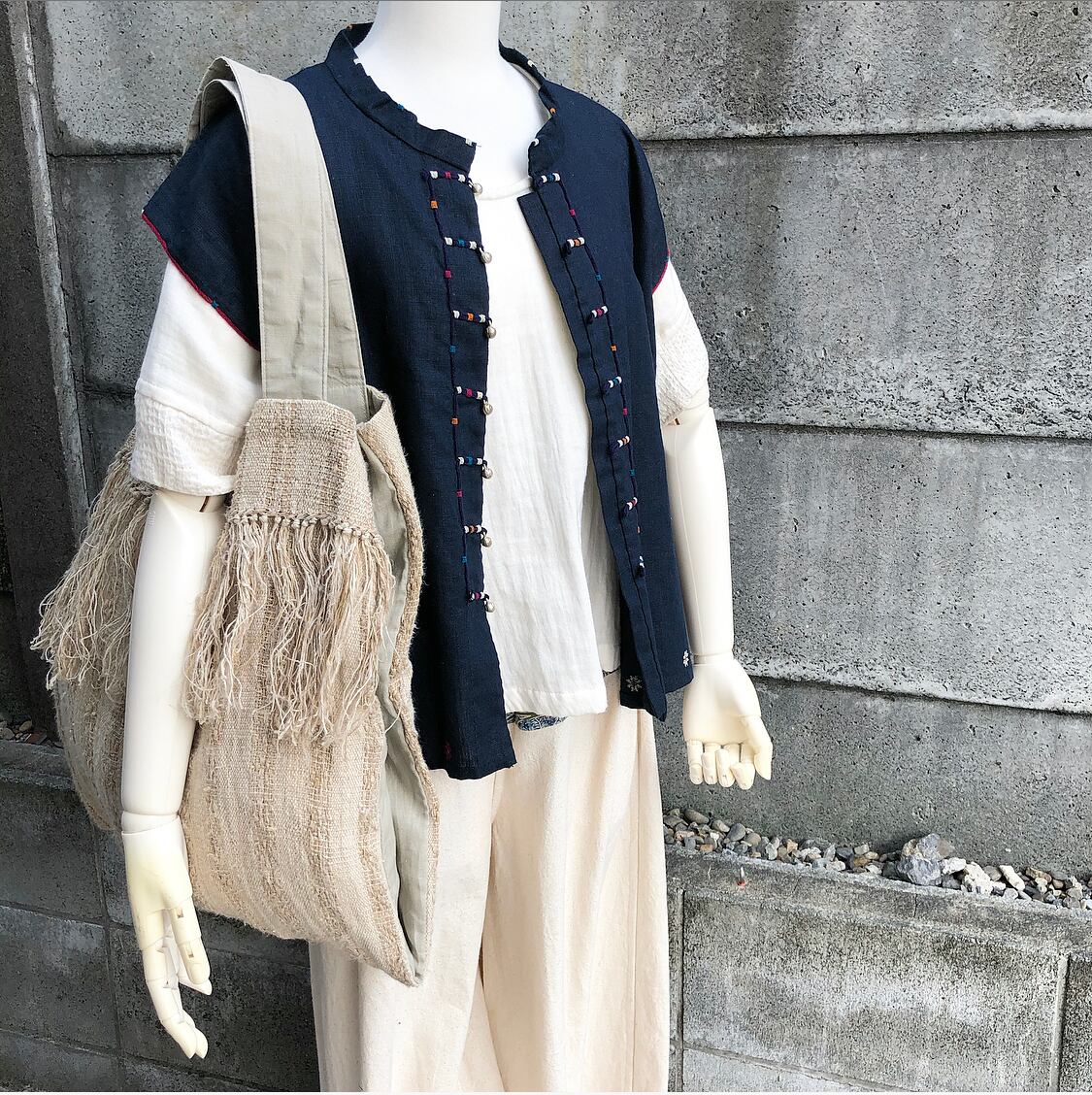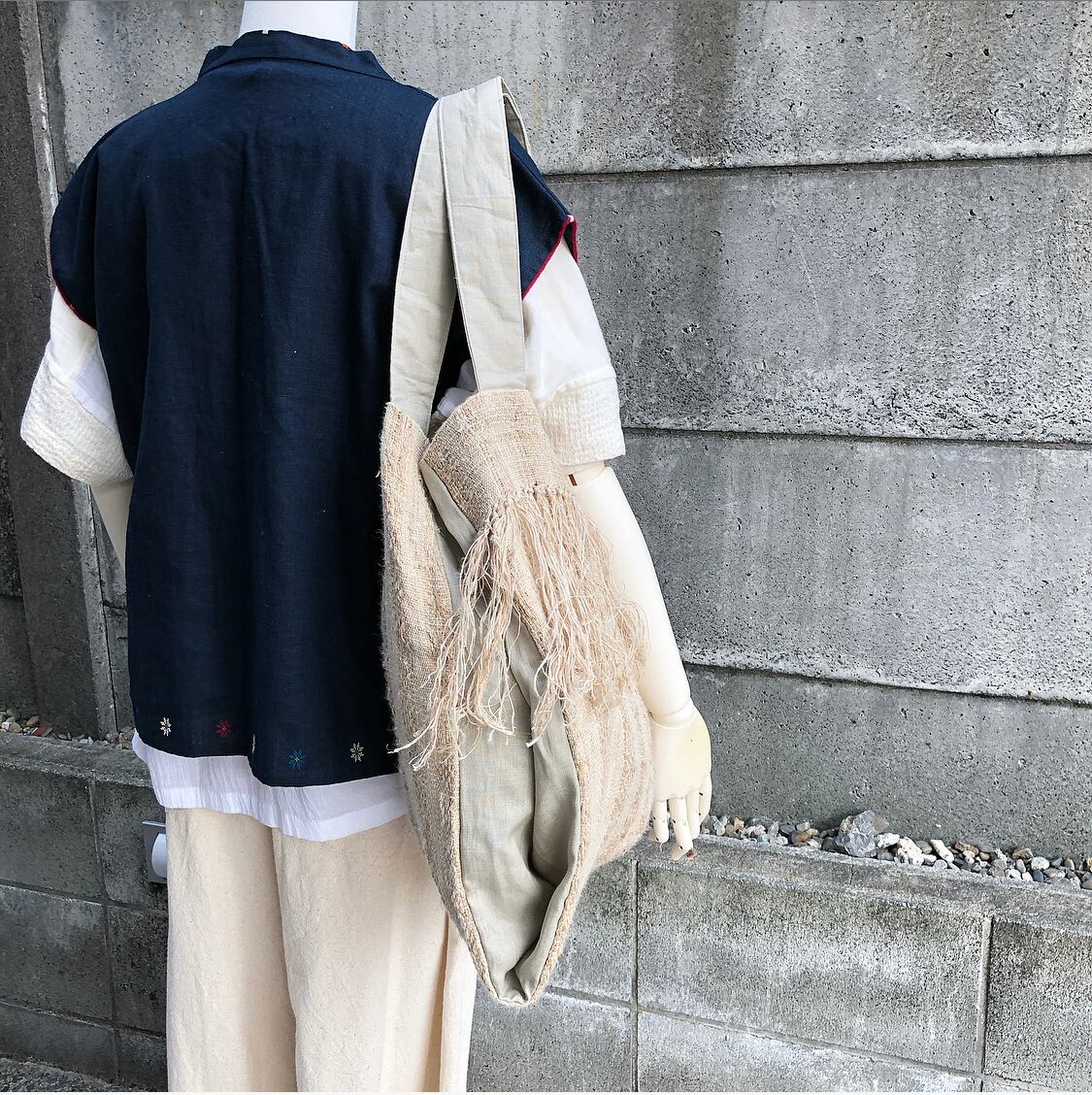ざっくりと織られた麻のワイルドな風合いと、揺れるフリンジ。
