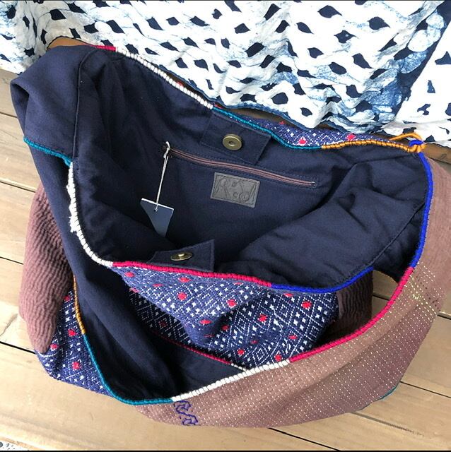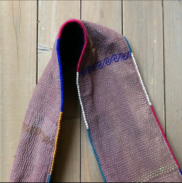 チワン族の布に合わせたのは、インドの細やかなランニングステッチが魅力の、ブラウンのラリーキルトです。