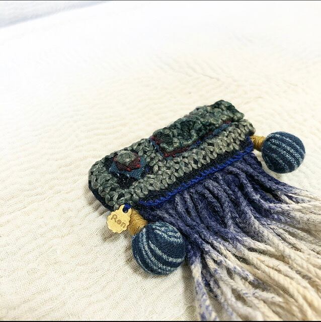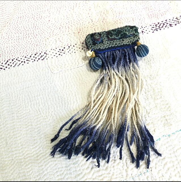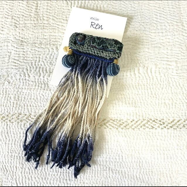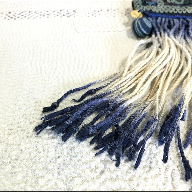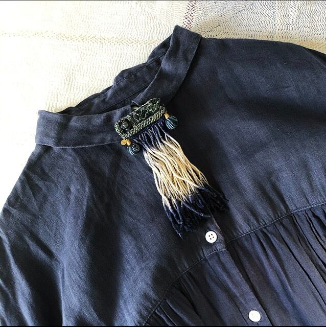 ◯ベトナム・黒モン族の民族衣装の藍染襟布と、フリンジを使用したブローチです。