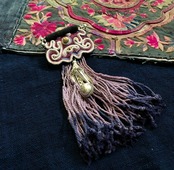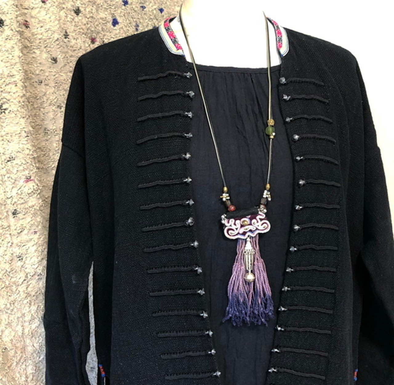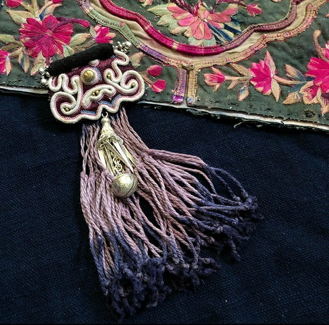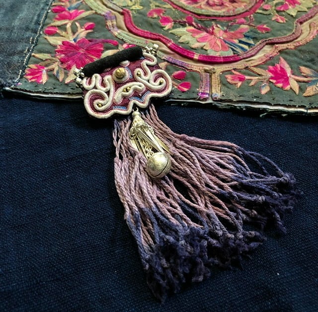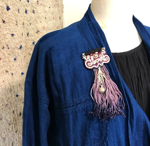 そんな刺繍布を主役に、同じくミャオ族の段染め麻のタッセル(民族衣装の装飾品)ミャオシルバーのパーツ(ネックレスのパーツの一部)も加え、更にアクセントとしてメタルビーズを装飾した、大人カラーの民族ブローチを製作しました。