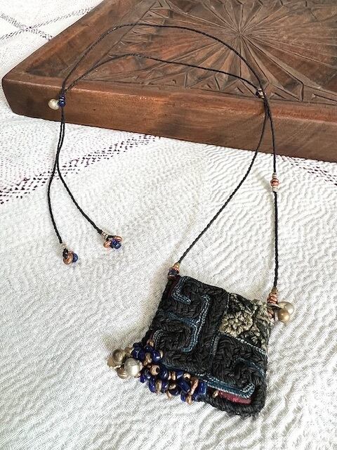 民族衣装の襟布の小さなパーツから、ペンダントトップを作りネックレスに仕上げました。